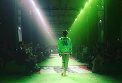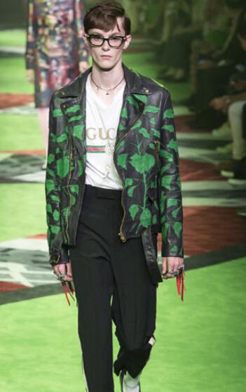 1、2017春夏的男装秀场上,gucci的秀场上继续用极致的颜色充斥整个秀场,上一季运用了深红,更符合秋冬的调调,而这一季运用的深绿更体现春夏的清凉和生机感。t台上蜿蜒流动的巨蟒配合深绿的空间犹如营造了一个动物森林,空灵而神秘。